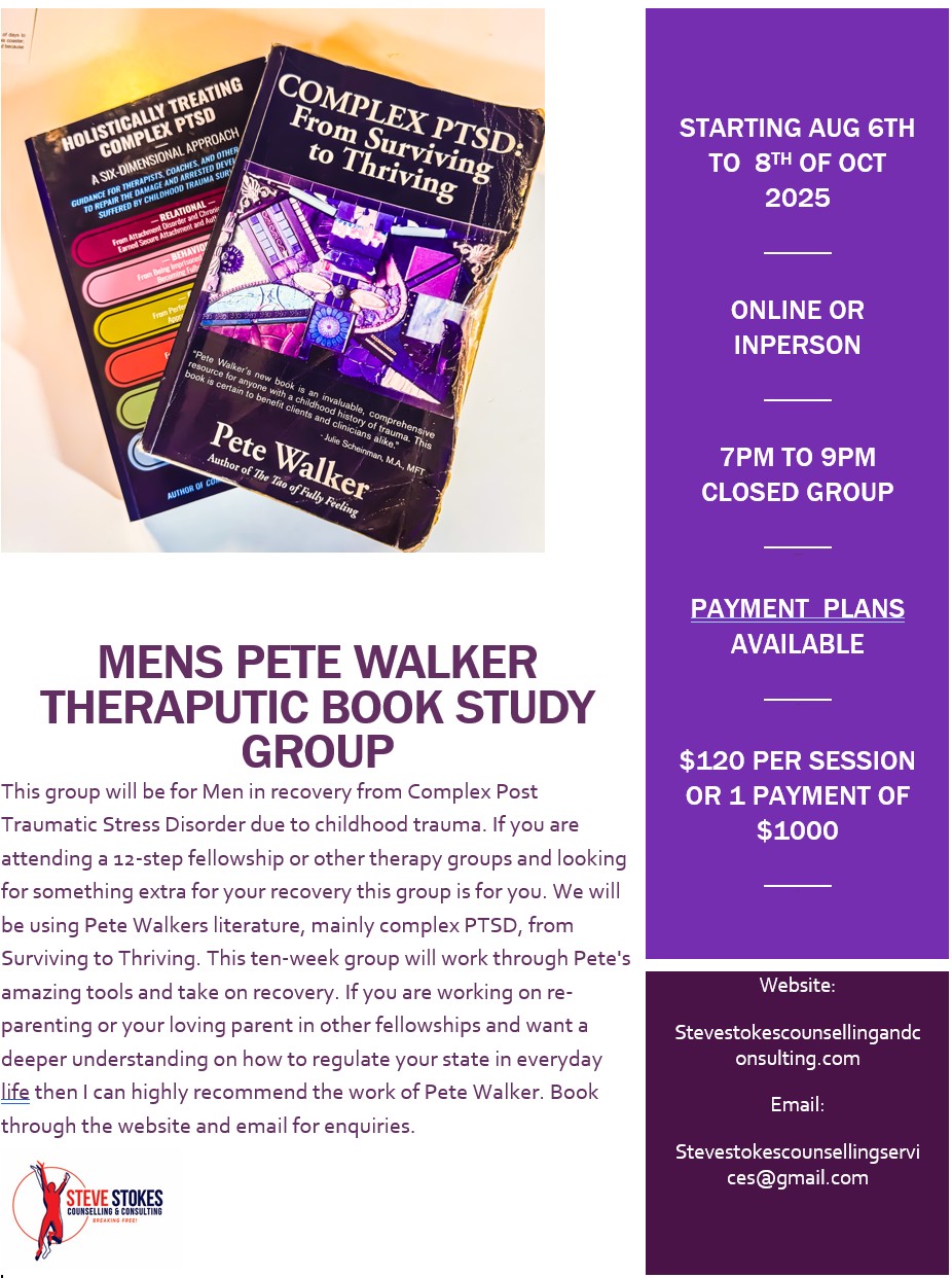 Mens Pete Walker Therapeutic Book Study Group is for men in recovery from complex Post Traumatic Stress Disorder (PTSD) due to childhood trauma. We will be using Pete Walker’s literature from Surviving to Thriving.